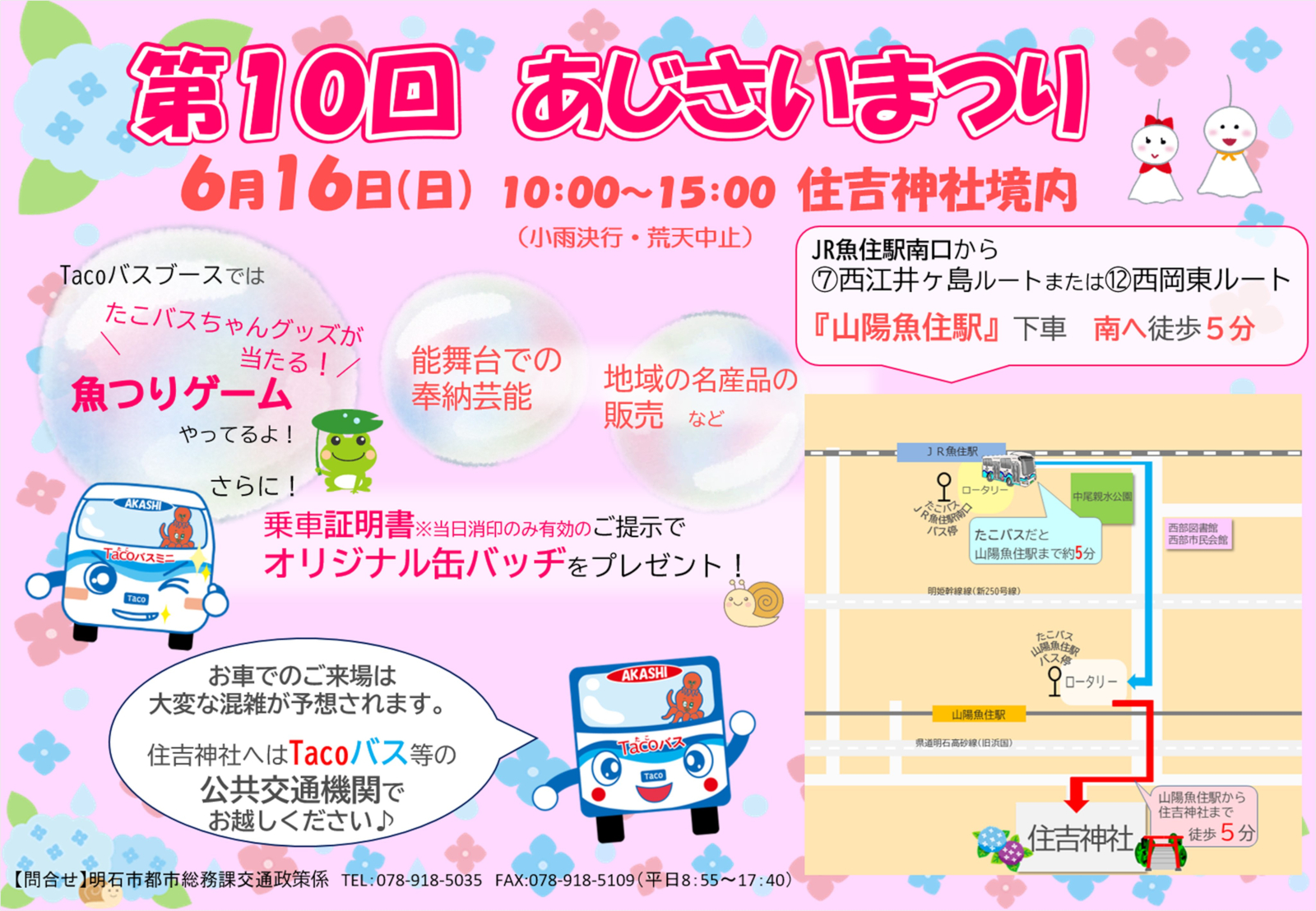 あじさいまつり紫陽花奉納芸能地域の名産品の販売Tacoバスブース住吉神社(魚住町中尾)開催日:6月16日(日)